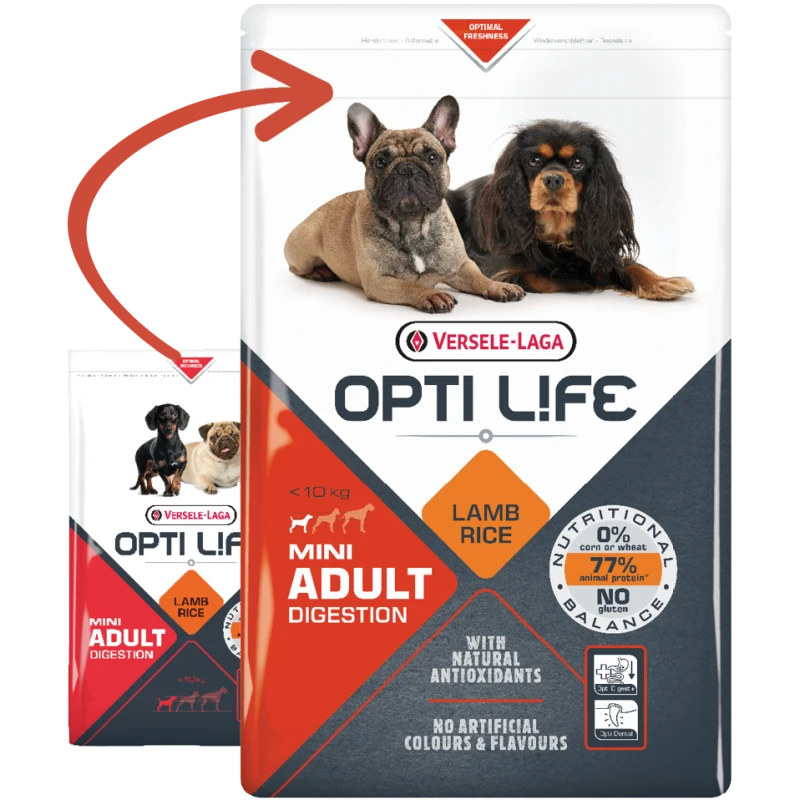Opti Life Adult Digestion Mini est une formule parfaitement équilibrée pour les petites races (-10kg) à base d’agneau et de riz, spécialement conçue pour votre chien à la digestion sensible.