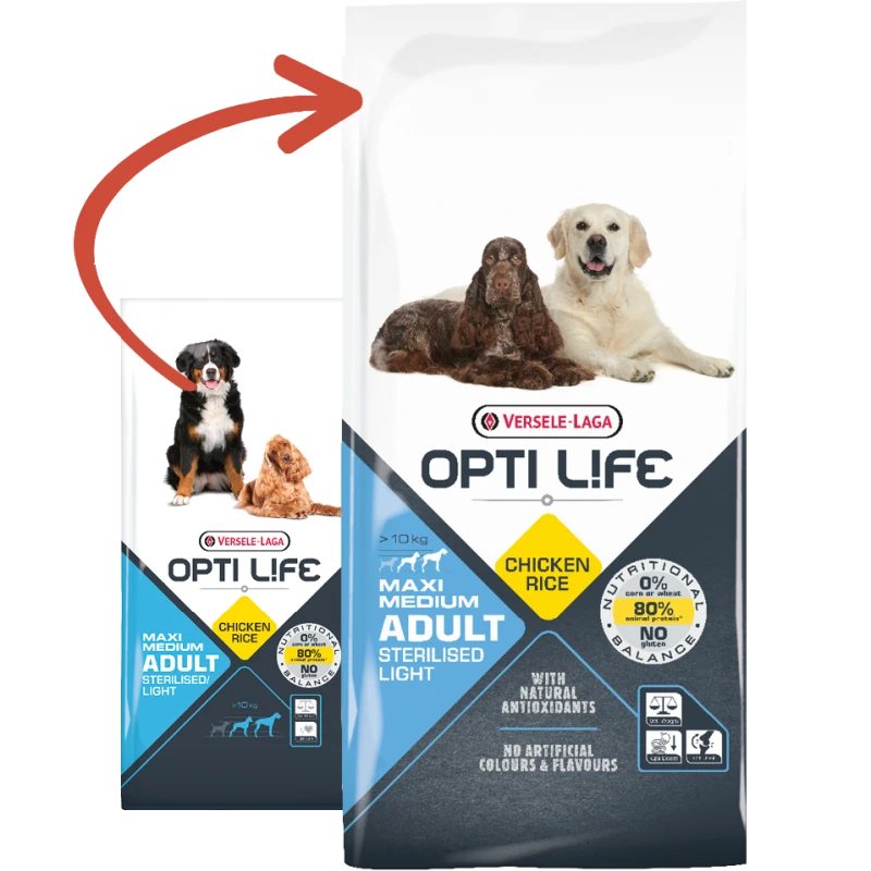 Opti Life Adult Sterilised/Light Medium & Maxi est une formule parfaitement équilibrée pour les races moyennes et les grandes races à base de poulet et de riz contribuant à maîtriser le poids corporel de votre chien.