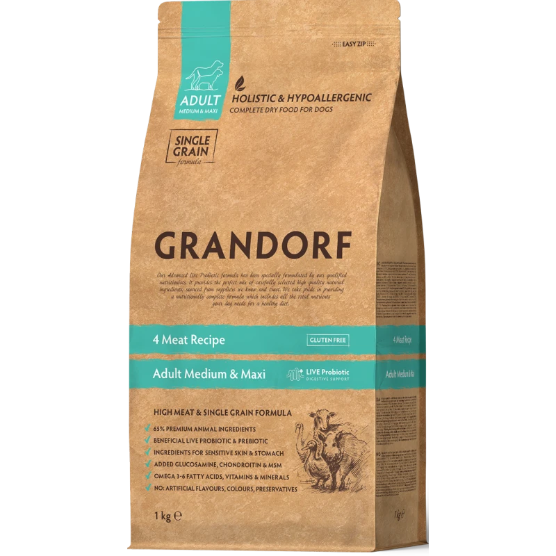 Chien Adult Medium & Maxi Races – 4 Viandes 1kg – Grandorf