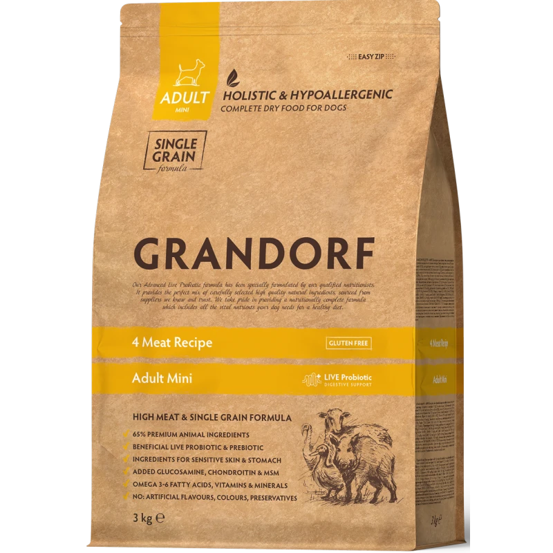 Formule riche en viande de dinde, d’agneau, de canard et de lapin, basé sur les protéines d’animaux pures et fournissant tous les acides aminés essentiels.