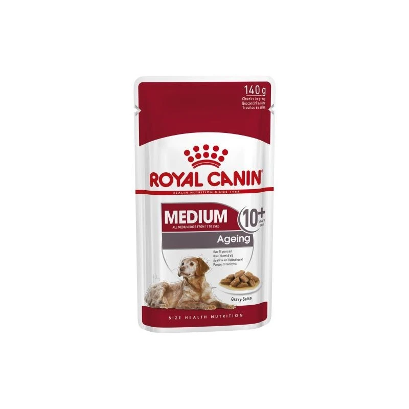 Royal Canin Medium Ageing 10+ Sachets pour chien est un aliment humide approprié pour le chien plus âgé, à partir de 10 ans. Cette nourriture est spécialement conçue pour les chiens âgés de races moyennes. Les ingrédients contiennent toutes les vitamines et minéraux importants dont votre chien a besoin pendant sa vieillesse. Il aide votre animal à maintenir sa vitalité et soulage les reins. La nourriture humide Royal Canin Medium Ageing 10+ est riche en protéines, grains et un complexe antioxydant.Ceci assure l’absorption des radicaux libres et contribue ainsi à ralentir le vieillissement cellulaire. La quantité adaptée de phosphore soutient les reins et grâce aux oméga 3, votre compagnon à quatre pattes conserve un beau pelage brillant et une peau saine.