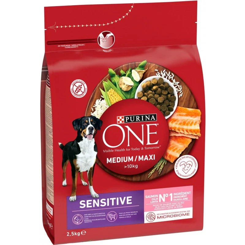 Medium/Maxi +10kg Sensitive – Riche en saumon avec du riz 2,5kg – One