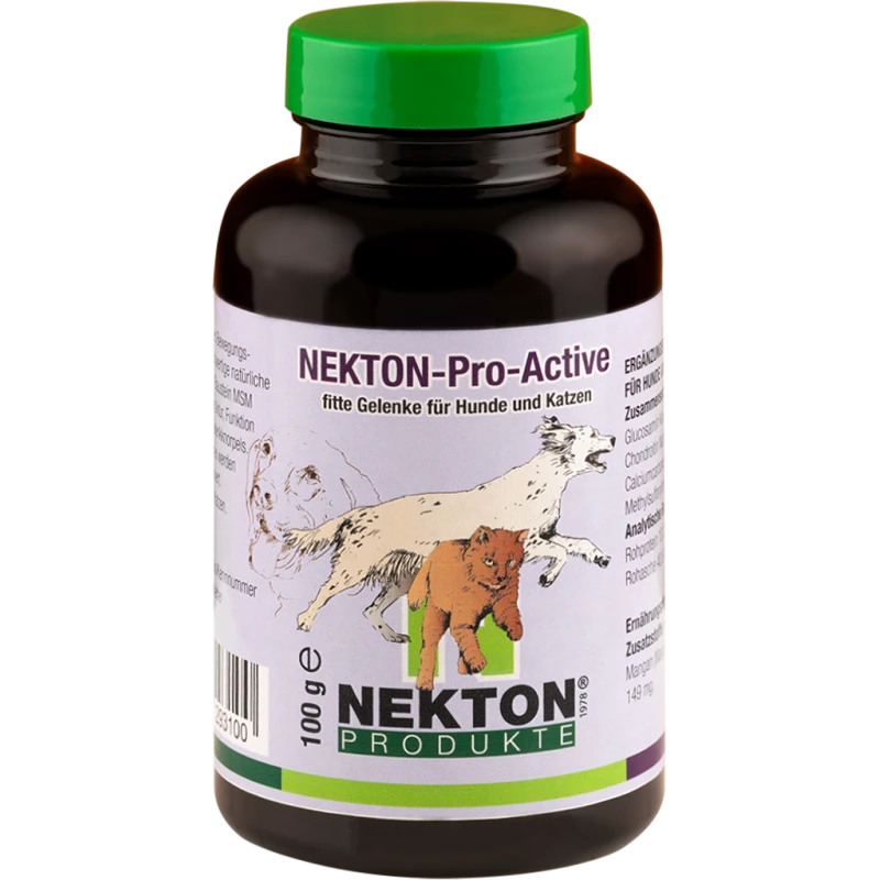 NEKTON-Pro-Active contient des ingrédients naturels et d’une grande valeur nutritive tels que la glucosamine, la chondroïtine ainsi que le composant méthyl-sulfonyl-méthane (MSM). La combinaison de ces éléments importants pour les articulations est utilisée depuis longtemps et avec succès pour traiter les douleurs articulaires chez l’homme et peut l’être également sans problème chez l’animal. NEKTON-Pro-Active vise à soutenir la structure, le fonctionnement et la solidité du cartilage articulaire. Pour les animaux actifs, une demi-dose par jour à titre préventif et pour rester en bonne santé. Les animaux déjà malades (souffrant d’arthrose par ex.) devront recevoir une dose plus importante afin d’améliorer leur état de santé. Toutes les articulations de l’animal seront protégées, soutenues et mobilisées. NEKTON-Pro-Active n’est pas un médicament et dévoile toute son efficacité après avoir été utilisé de façon ininterrompue durant env. 15 jours.