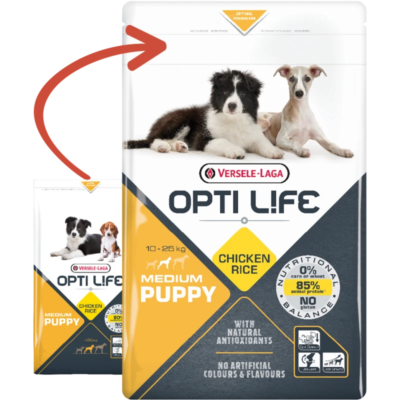 Opti Life Puppy Medium est une formule parfaitement équilibrée pour les races moyennes (10kg à 25kg) à base de poulet et de riz, spécialement développée pour répondre à tous les besoins nutritionnels de votre chiot en pleine croissance.