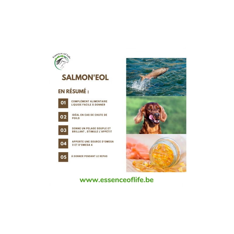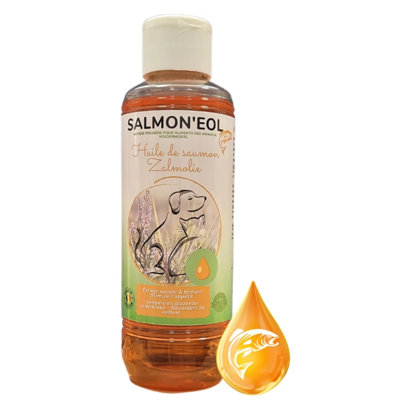 Description : Aliment complémentaire en solution buvable composée d’huile de saumon pressée à froid. Idéal en cas de chute de poils, redonne souplesse et brillance aux poils et facilite le brossage. Salmon’eol apporte une source d’Oméga 3 et 6 qui améliore le système cardio-vasculaire et l’activité cérébrale.
