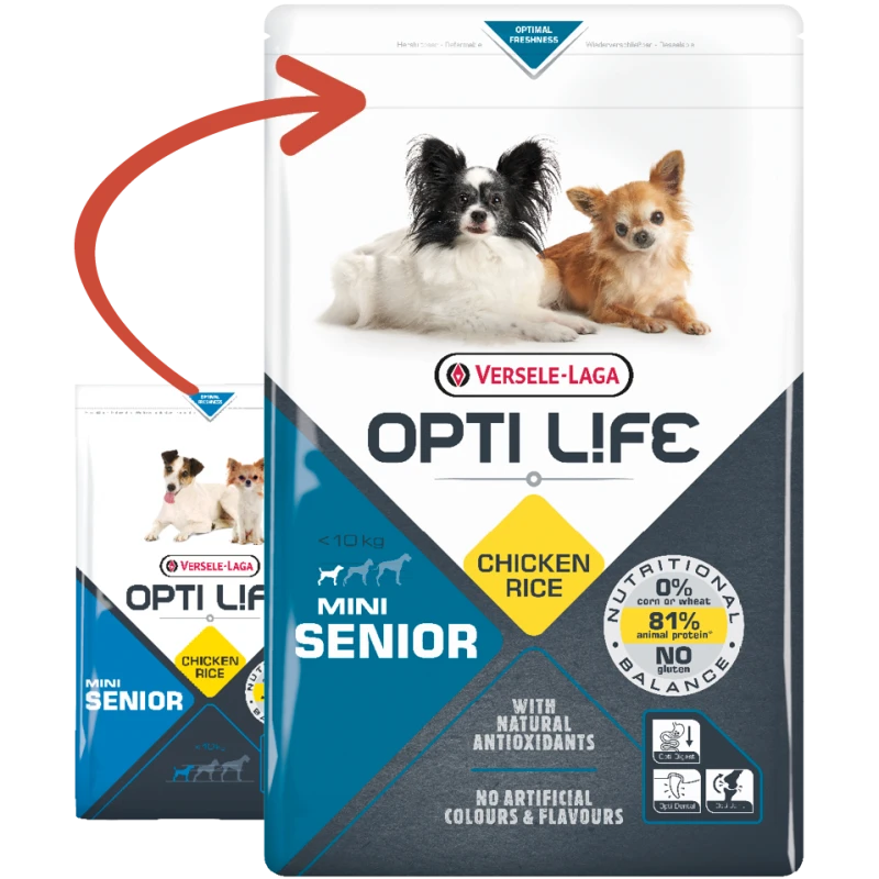 Opti Life Senior Mini est une formule parfaitement équilibrée pour les petites races (-10kg) à base de poulet et de riz, spécialement développée pour que votre chien vieillisse en conservant santé et vitalité.