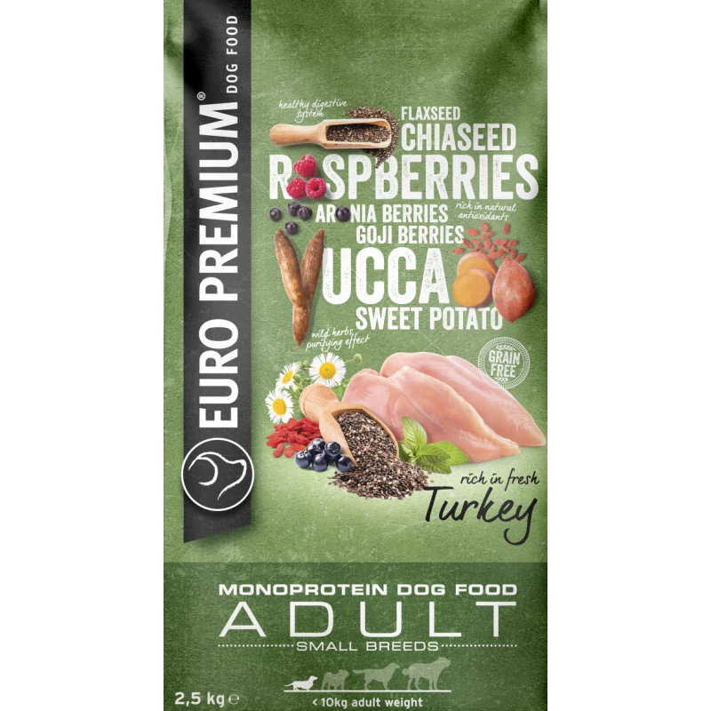 Un produit entièrement sur mesure pour votre chien. Un produit alimentaire équilibré, riche en viande fraîche, agrémenté d’une multitude de fruits, d’herbes et sans céréales. Cet aliment se compose d’ingrédients bien dégistibles triés sur le volet et de dinde pour une source unique de protéines animales. La chicorée séchée apporte de l’inuline pour stimuler la fonction intestinale. Le yucca est ajouté pour atténuer l’odeur des selles. Euro-Premium Small Puppy Turkey est enrichi d’une combinaison d’huile de saumon et d’huile de tournesol pour un ratio idéal d’oméga-3 en d’oméga-6. Ses antioxydants naturels dérivés de super aliments (baies de goji, framboises et baies d’ariona) renforcent le système immunitaire.