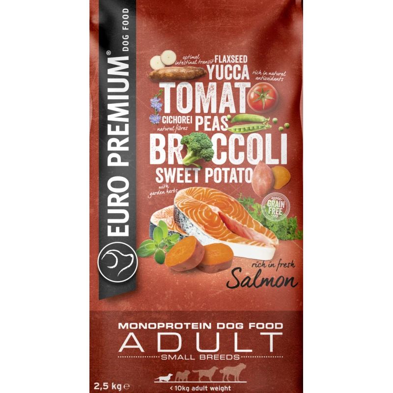 Un produit entièrement sur mesure pour votre chien. Un produit alimentaire équilibré, riche en poisson frais, agrémenté d’une multitude de légumes, d’herbes et sans céréales. Cet aliment se compose d’ingrédients bien dégistibles triés sur le volet et de saumon pour une source unique de protéines animales. La chicorée séchée apporte de l’inuline pour stimuler la fonction intestinale. Le yucca est ajouté pour atténuer l’odeur des selles. Euro-Premium Small Adult Salmon est enrichi d’une combinaison d’huile de saumon et d’huile de tournesol pour un ratio idéal d’oméga-3 en d’oméga-6.
