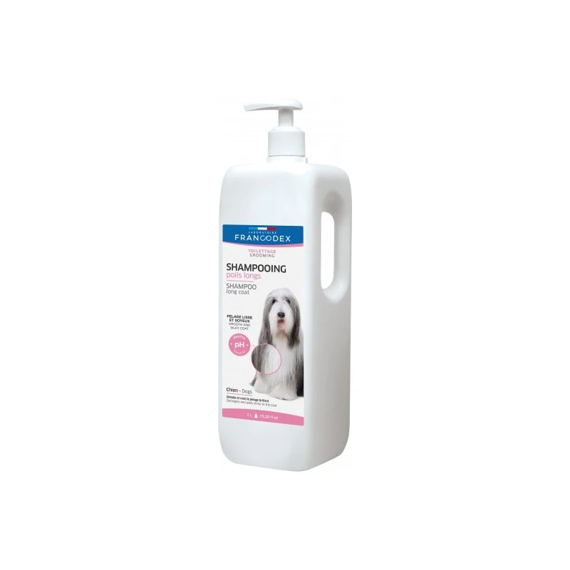 Formulé avec de l’huile de karité, le SHAMPOOING POILS LONGS FRANCODEX permet de démêler le poil et de le rendre doux et soyeux.